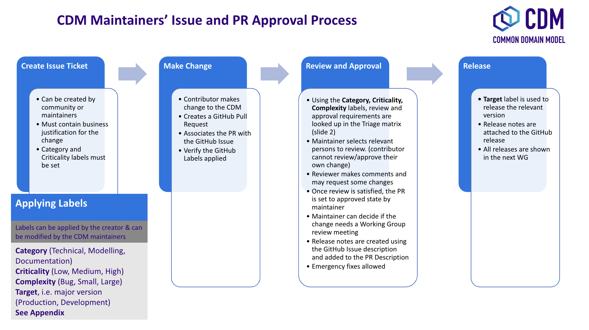 The CDM Development Guidelines are defined by the Steering Working Group. The full set of CDM development guidelines for how contributions are reviewed can be found here.